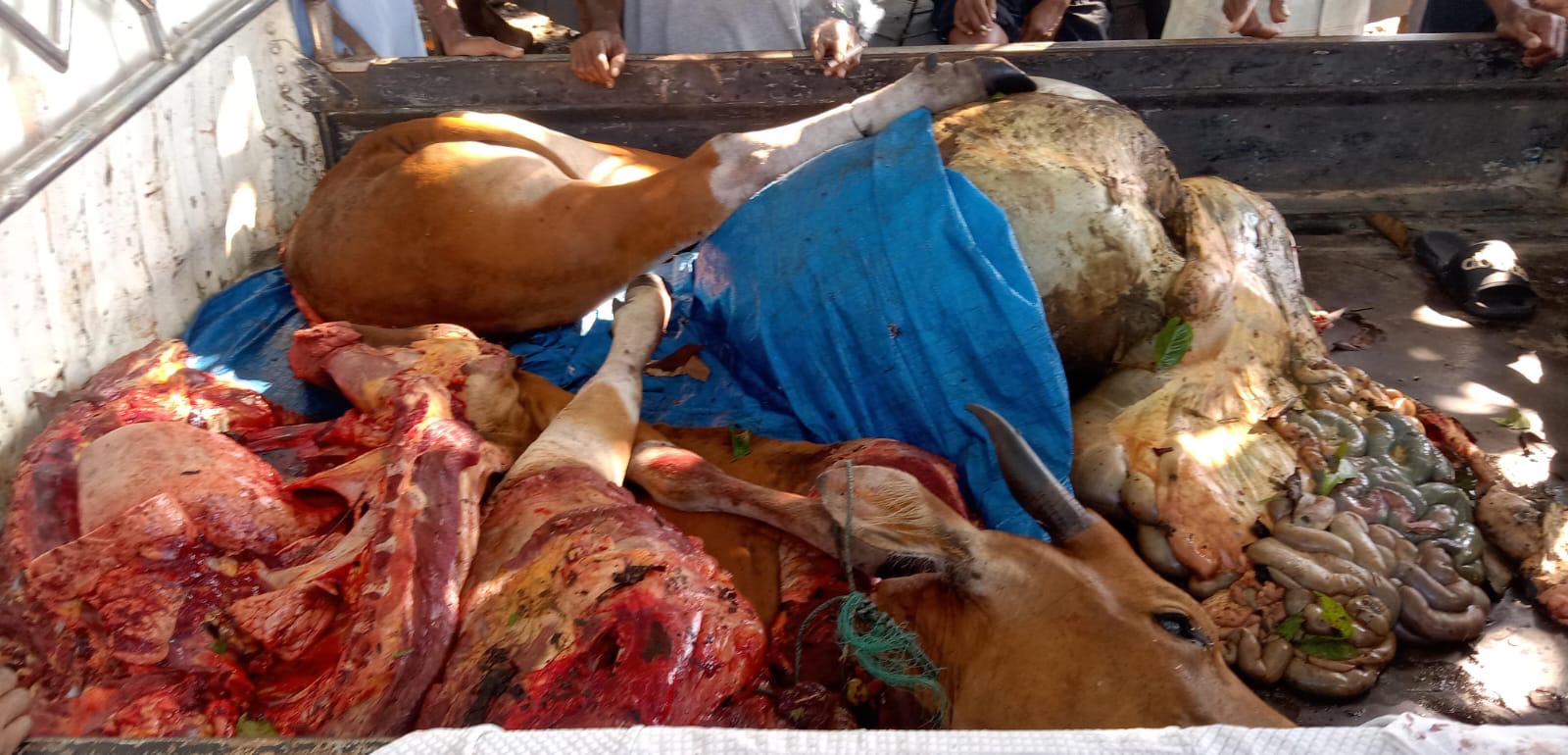 Tak berselang lama, warga berhasil menangkap pelaku pencurian sapi dan mengamankan satu unit pick up putih berisi daging sapi.