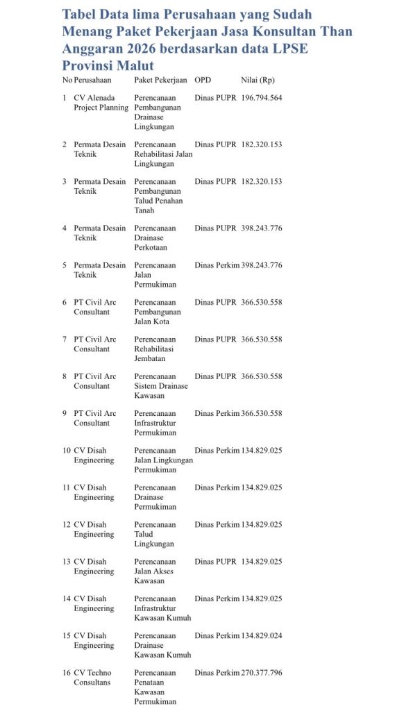 Data menunjukkan angka Rp3,9 meliputi 16 paket jasa konsultan untuk tahun anggaran 2026.