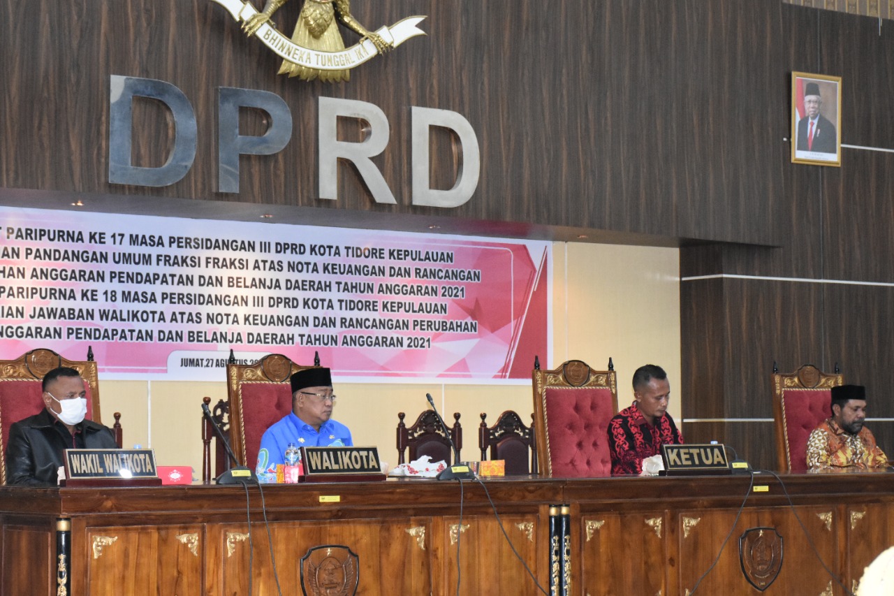TIDORE-PM.com, Dewan Perwakilan Rakyat Daerah (DPRD) Kota Tidore Kepulauan ,Jumat ( 27/8), menyetujui nota keungan dan rancangan APBD Perubahan tahun 2021 dengan sejumlah saran, pertimbangan dan masukan sebagai bagian dari keseriusan DPRD dalam menunjukan tugas dan pengawasannya.