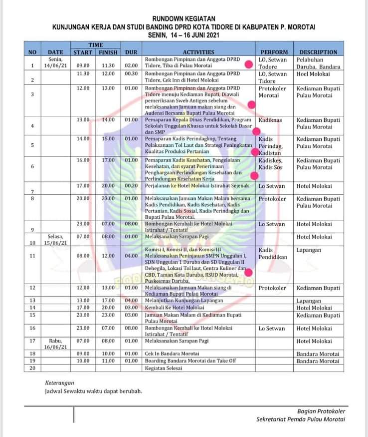 Hal ini berdasarkan data yang dikantongi media ini sesuai rundown kegiatan kunjungan kerja dan studi banding DPRD kota Tidore Kepulauan di Kabupaten Morotai Senin 14-16 Juni 2021.