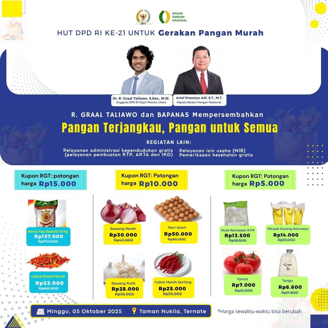 Dr. R. Graal Taliawo, S.Sos., M.Si. memaknai hari kelahiran dan kehadiran DPD secara mendalam. Ia ingin merayakan HUT ini dengan lebih mendekatkan diri ke warga. Bekerja sama dengan Badan Pangan Nasional (BAPANAS) dan Pemerintah Kota Ternate (Dinas Ketahanan Pangan), Dr. Graal menginisiasi kegiatan Gerakan Pangan Murah (GPM).