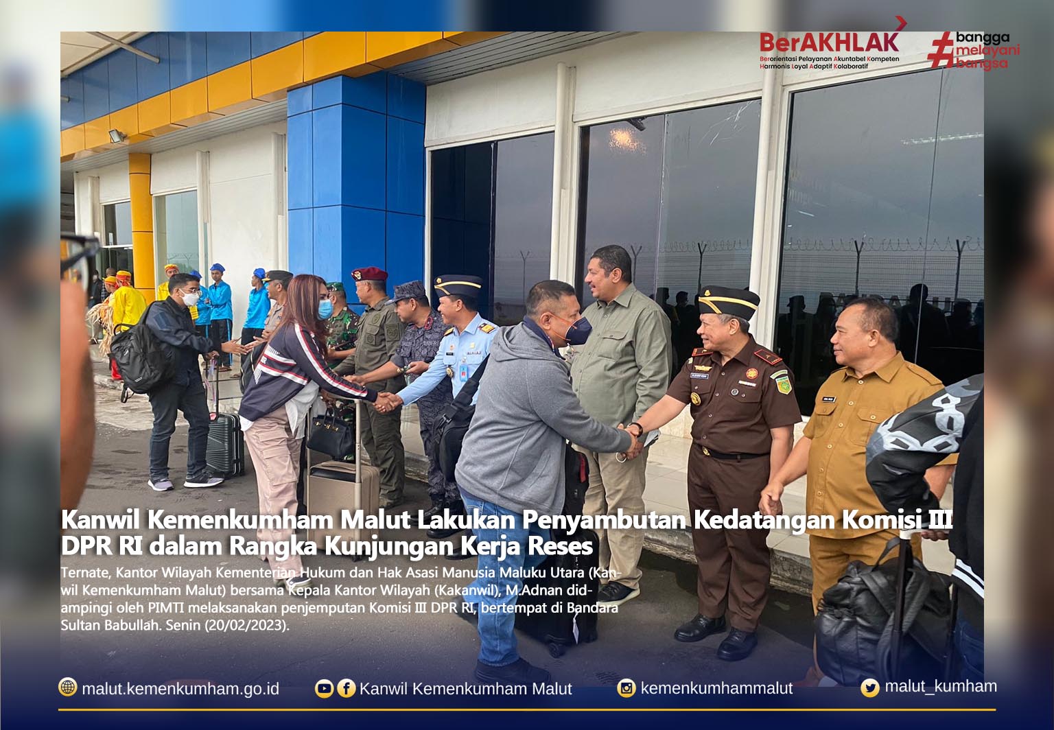 TERNATE-pm.com, Kepala Kantor Wilayah (Kakanwil) Kementerian Hukum dan Hak Asasi Manusia Maluku Utaru (Kemenkumham Malut), M.Adnan didampingi PIMTI ikut dalam kegiatan penjemputan Komisi III DPR RI, bertempat di Bandara Sultan Baabullah, Senin (20/02/2023).