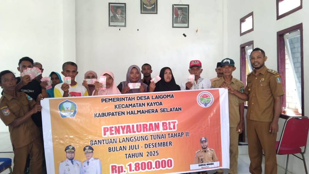 poskomalut, Pemerintah Desa (Pemdes) Laigoma, Kayoa, Halmahera Selatan, salurkan bantuan langsung tunai (BLT) dan dana desa (DD) tahap I-II kepada keluarga penerima manfaat (KPM), Selasa (16/9/2025).