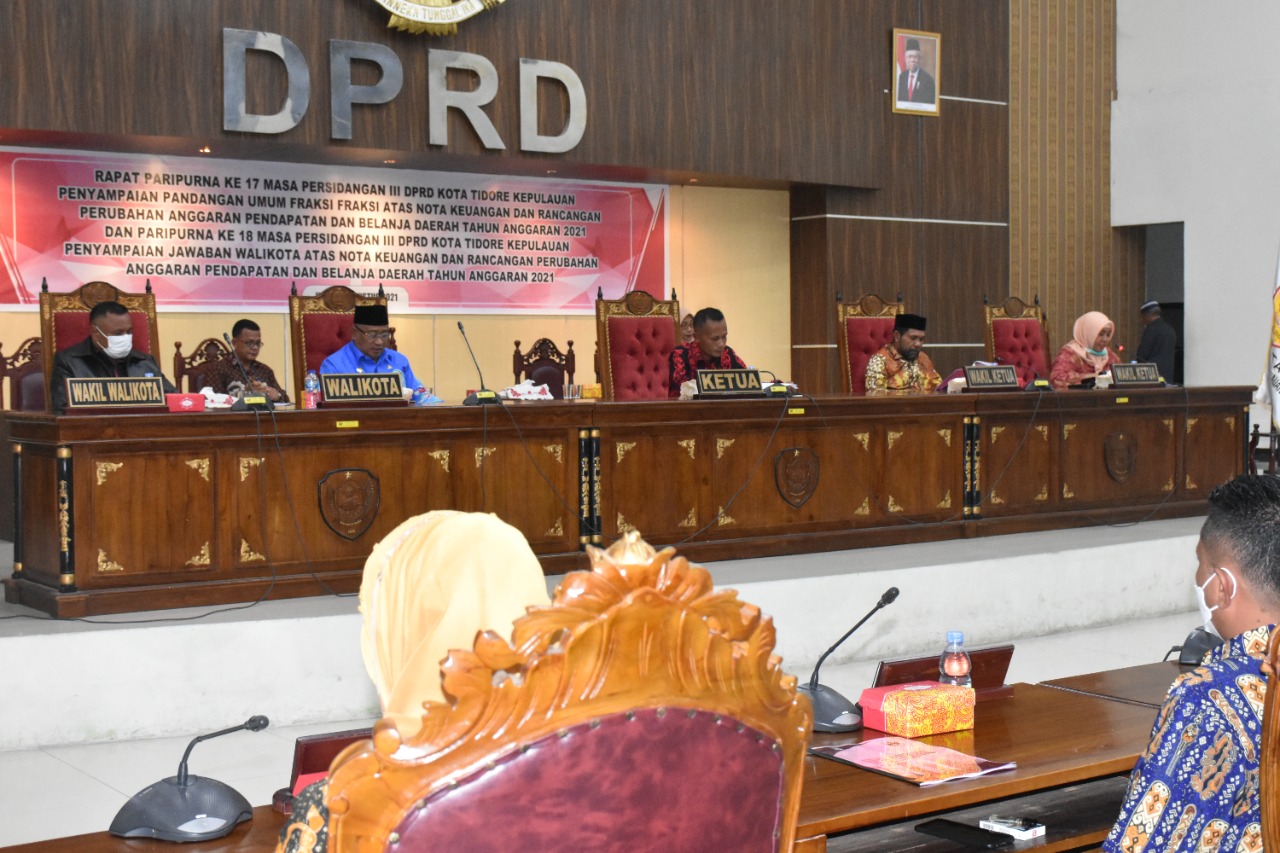 Rapat paripurna tersebut dipimpin oleh Ketua DPRD Kota tidore Kepulauan Ahmad Ishak dan diikuti oleh 25 Anggota DPRD Kota Tidore, Turut hadir juga Wakil Walikota Tidore Kepulauan Muhammad Sinen, Forkompimda Kota Tidore, Sekretaris Daerah, Ketua Dharmawanita Persatuan Kota Tidore, Para Staf Ahli Wali kota, Asisten Sekda, Pimpinan OPD, Camat, Lurah dan Insan Pers. diakhiri dengan penyerahan Nota Keuangan Rancangan Perubahan APBD Tahun Anggaran 2021 oleh Walikota Tidore Kepulauan Capt H. Ali Ibrahim dan diterima oleh Ketua DPRD Kota tidore Kepulauan Ahmad Ishak.(mdm)