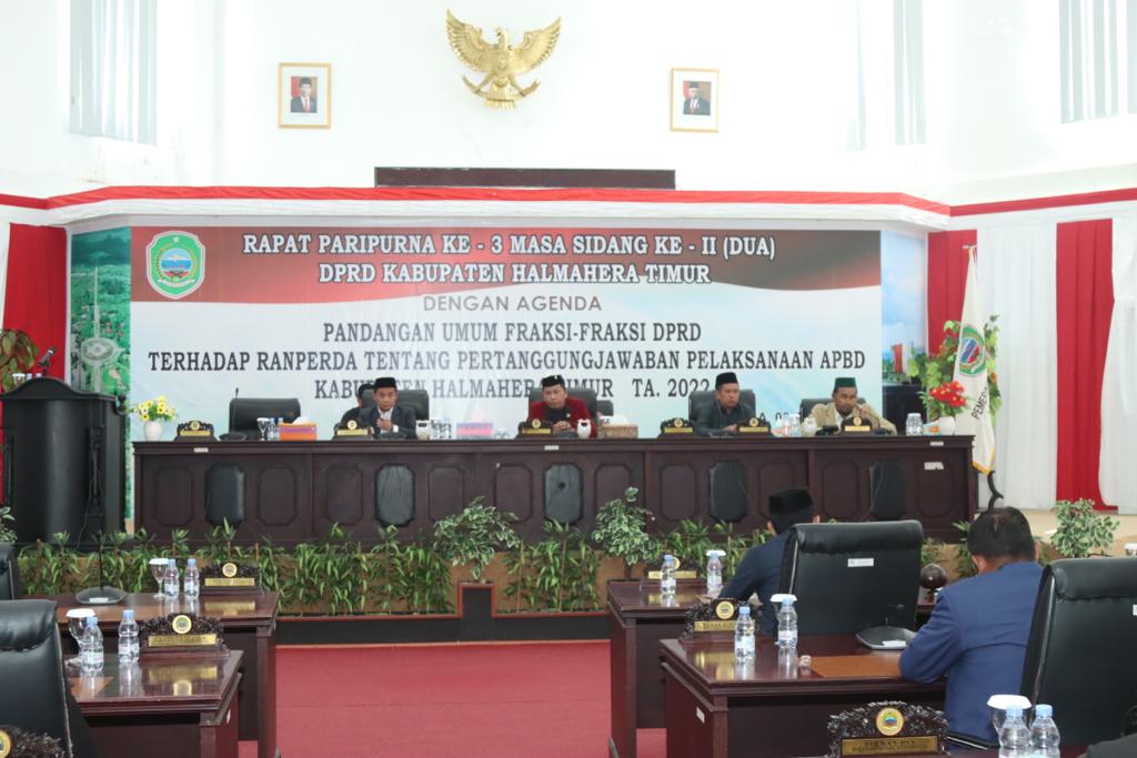 MABA-pm.com, Tiga Fraksi Dewan Perwakilan Rakyat Daerah (DPRD) Kabupaten Halmahera Timur (Haltim) menyampaikan pandangan umum Ranperda Pertanggung Jawaban pelaksanaan APBD 2022.