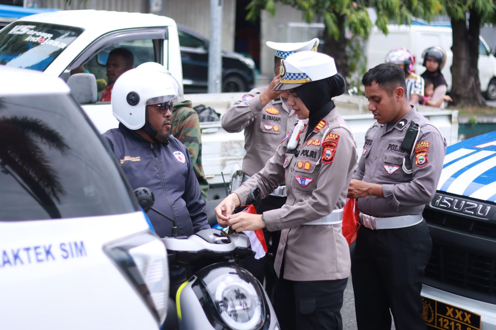 poskomalut, Satuan Lalu Lintas (Satlantas) Polres Ternate bagi-bagi bendera Merah Putih kepada pengendara sepeda motor.